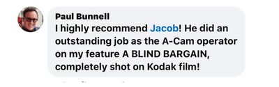 Jacob's skills as an Operator or Steadicam would be a valuable asset to the creative process of any successful production.